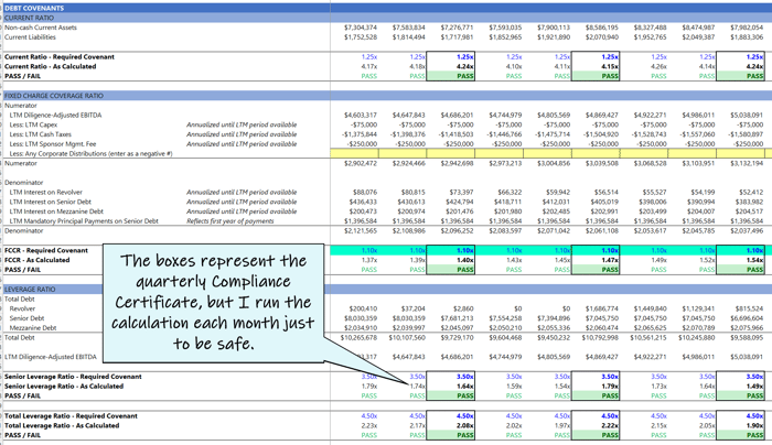 Although debt covenants are typically reported quarterly (via a "compliance certificate"), I like to run the calculation in my model every single month, because it helps me stay ahead of any potential issues: