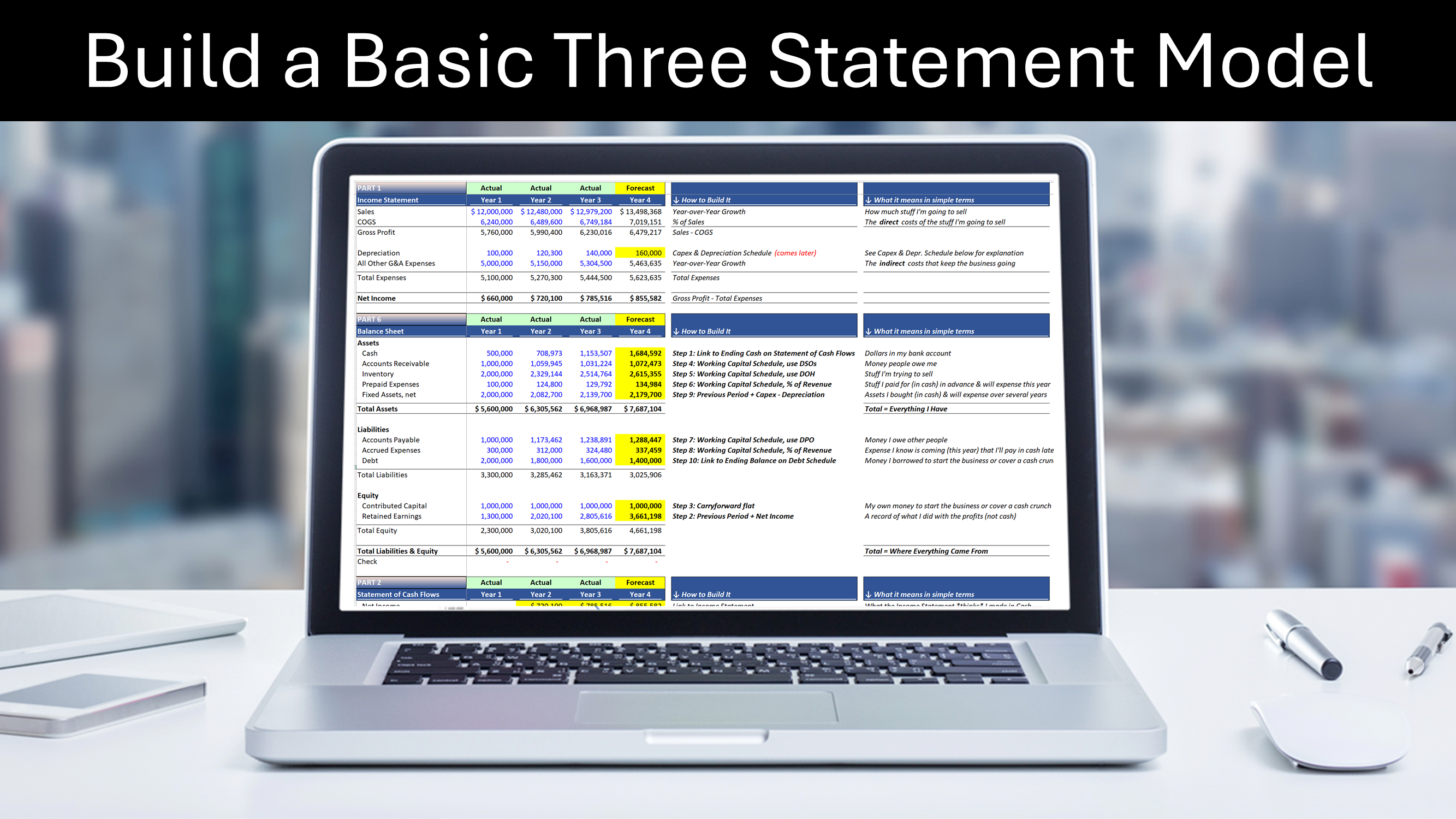 This is a "warm-up" course (only 45 mins) that quickly guides you through the fundamentals of building a Three Statement Model (using five primary steps).